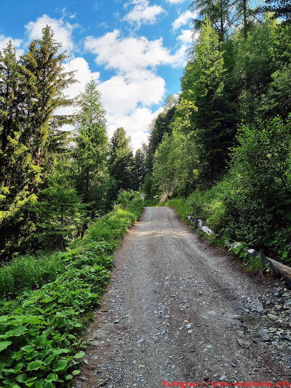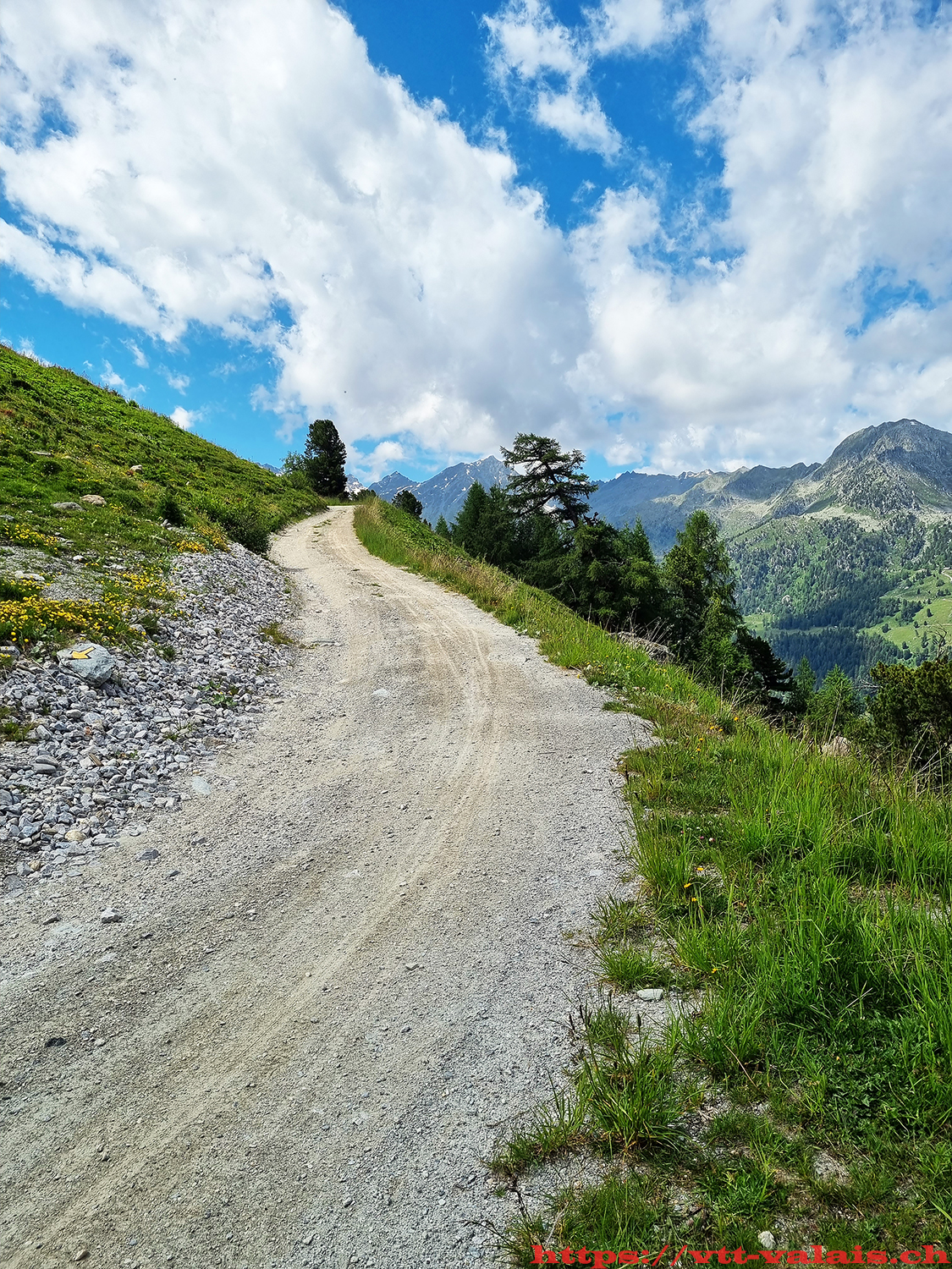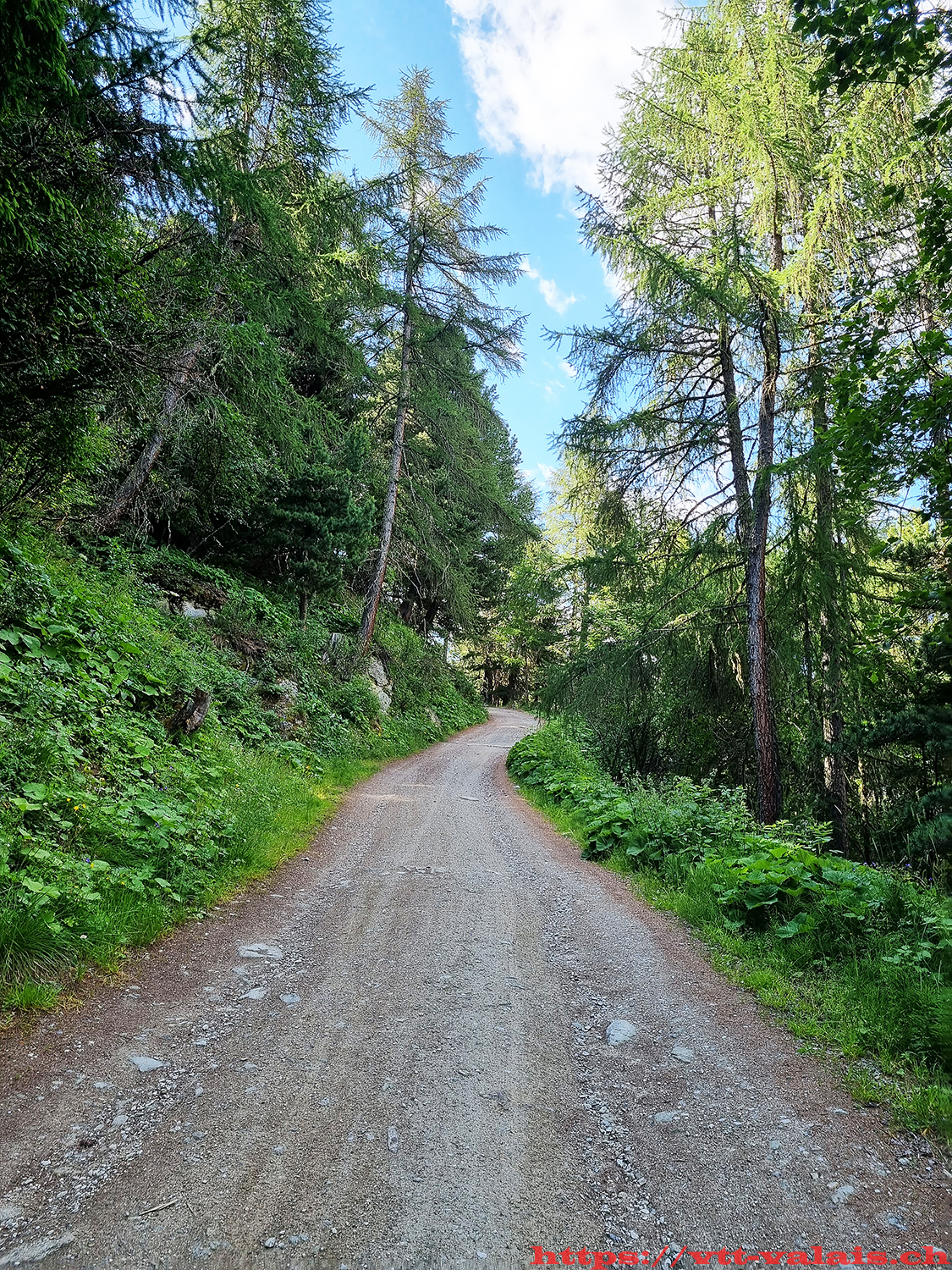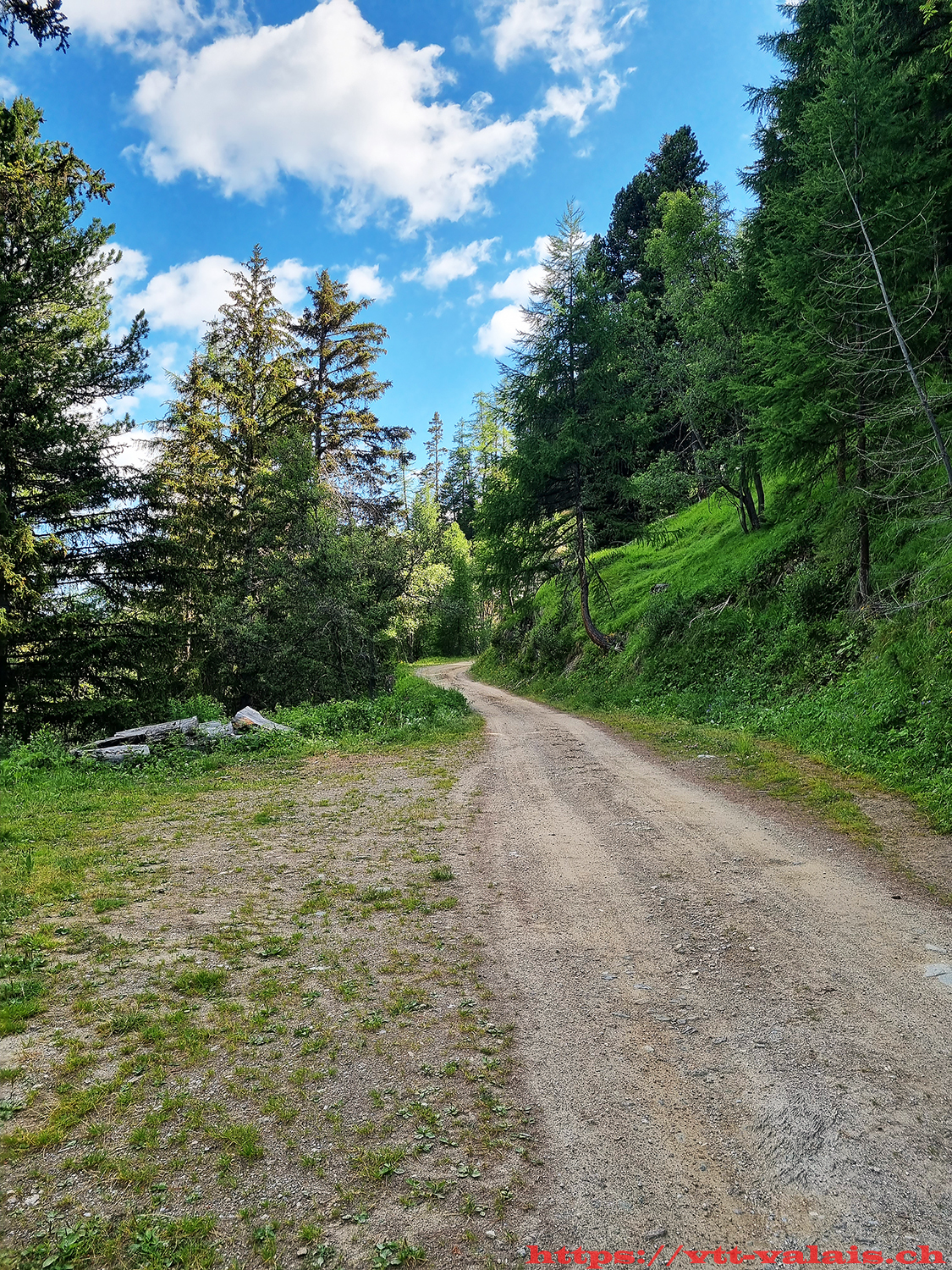 Ensuite vous serez amené à traverser une partie d’alpage et forêt sur un chemin de terre très roulant bien qu’un peu plus difficile que sur la route de Bleusy à Siviez.