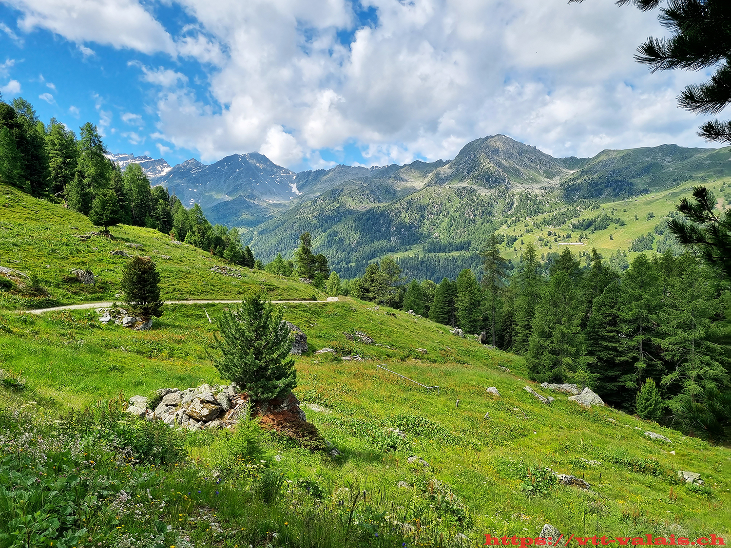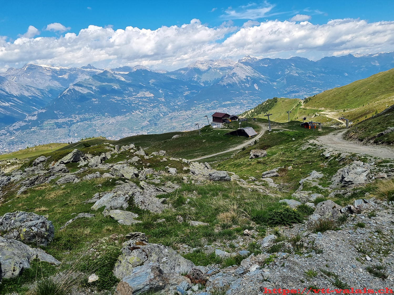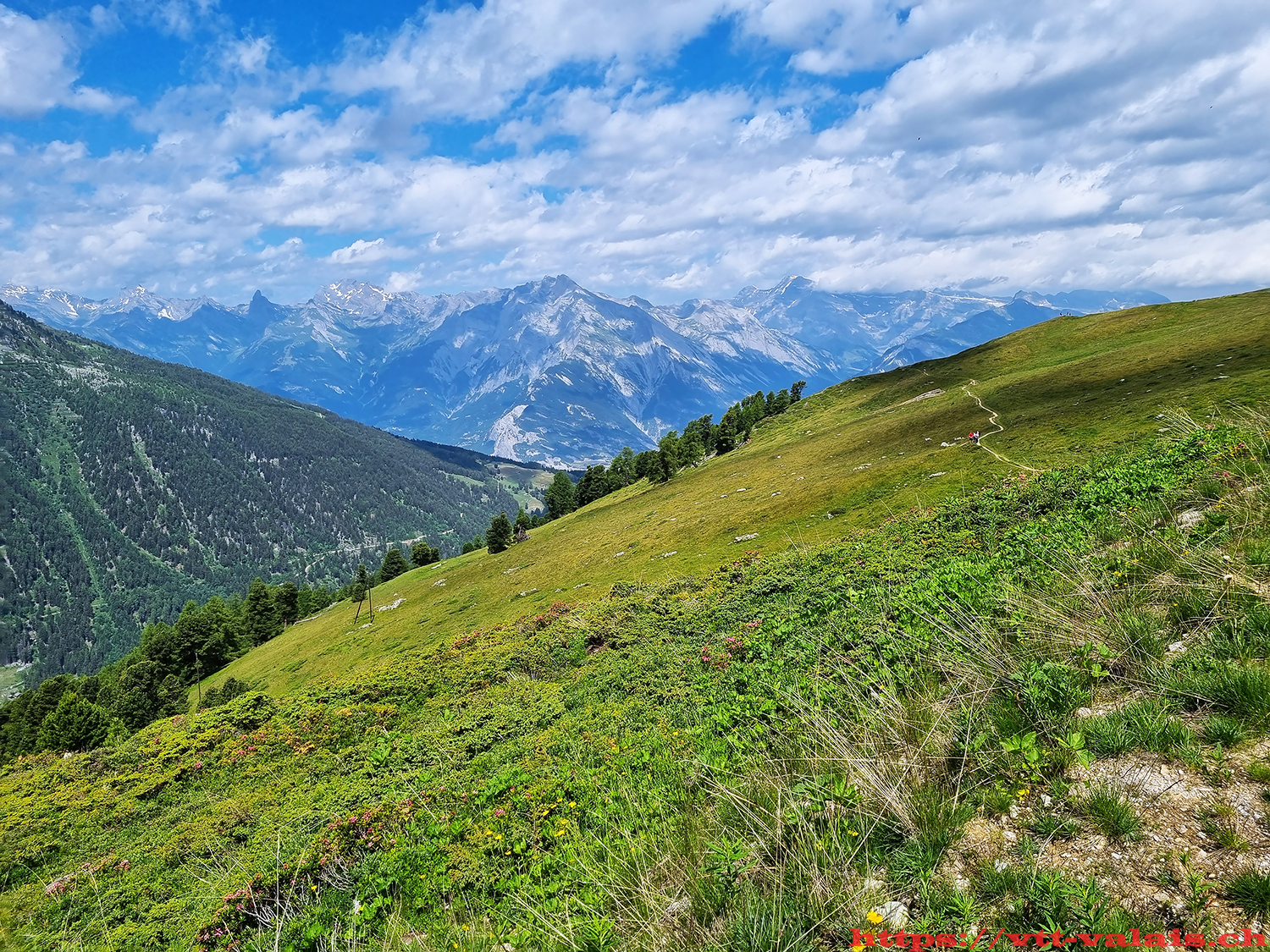 Ce jour-là, j’ai décidé de partir du côté Est en direction de Combatzeline en totale découverte de ce « quartier » de Siviez. Eh bien encore une fois je n’ai pas été déçu, la montée se déroule dans des environnements variés d’alpage, de forêts avec toujours une vue sur la plaine du Rhône pour finalement atteindre le haut du télésiège le Greppon Blanc où le panorama est splendide.