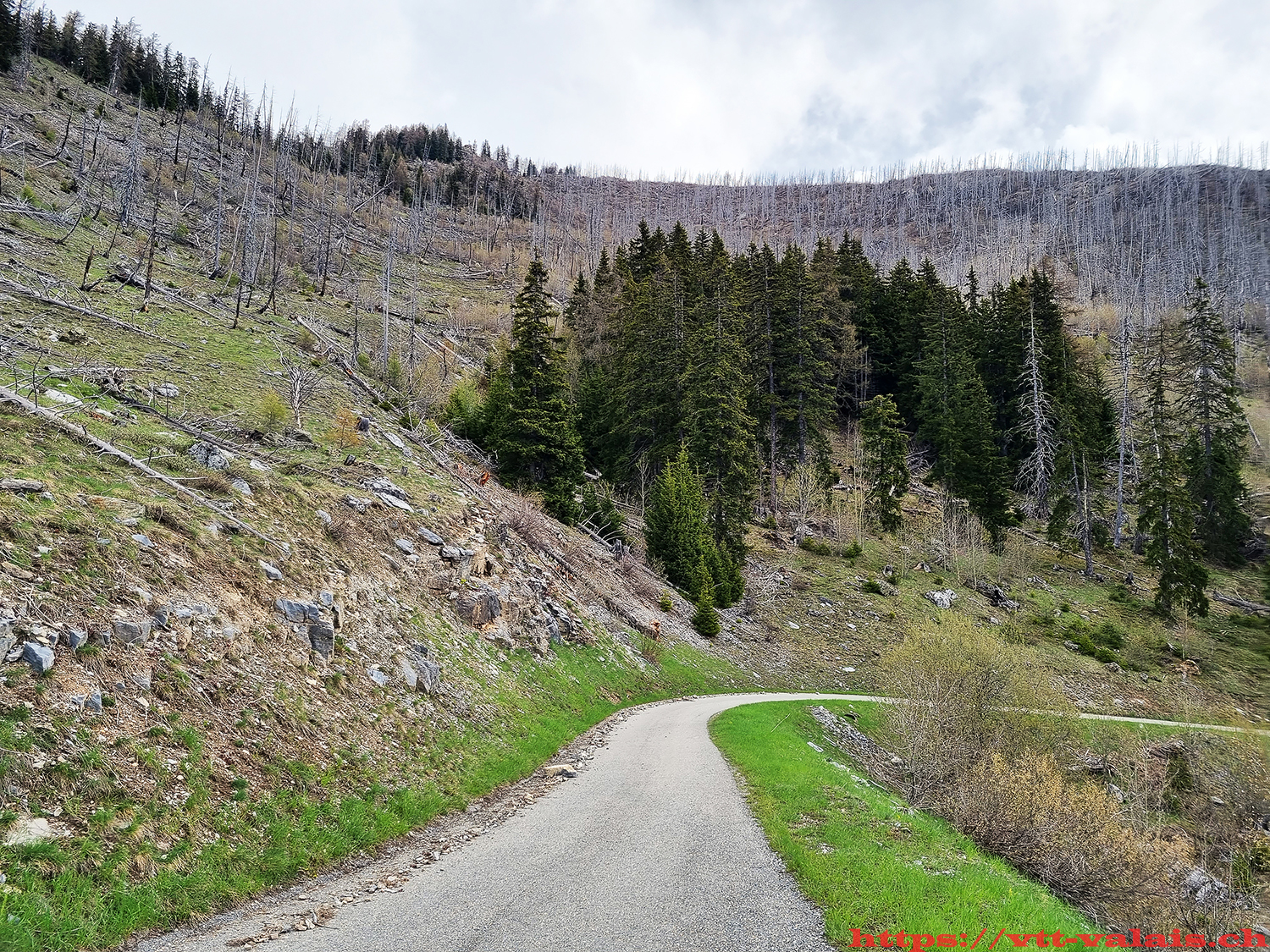 Vous constaterez également, grâce aux images prises par drone, qu’une partie de la randonnée traverse une région emplie d’arbres calcinés. Cette région se nomme Guggerhubel.